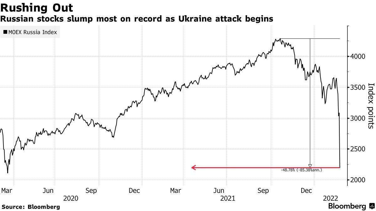 Russian Stocks' 33% Crash Is Fifth-Worst Plunge in Market History Russian stocks now have cheapest valuation among 90 indexes. This is the first time since 1987 that a selloff of this magnitude has hit a market worth more than $50 billion. In the aftermath of the Black Monday crash that year, Hong Kong's Hang Seng Index tumbled 33%.