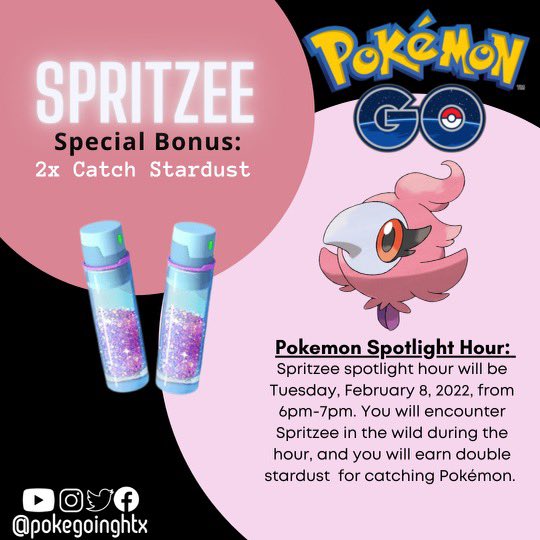 Pokemon Go Spotlight Hour schedule for February 2022 6 days ago — Pokemon Go February 2022 Spotlight Hour schedule ; February 1, 6PM – 7PM, Litleo ; February 8, 6PM – 7PM, Spritzee ; February 15, 6PM – 7PM ...February 22: 6PM – 7PM