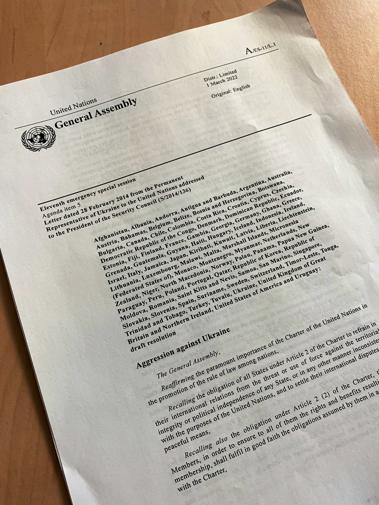 UN passes resolution condemning Russia's invasion of Ukraine; China... The United Nations General Assembly condemned Russia's invasion of Ukraine and demanded they withdraw immediately. The vote was met with a standing ovation. Ahead of the vote Wednesday, U.S. Ambassador to the U.N. Linda Thomas-Greenfield called the rare emergency special session an... General Assembly resolution demands end to Russian... | UN News The UN General Assembly overwhelmingly adopted a resolution on Wednesday demanding that Russia immediately end its military Assembly President Abdulla Shahid struggled to read the results of the vote as ambassadors began applauding, and then standing up, as he started speaking. › a › un-security-council-plans-vote-to-call-general-assemblyUN Security Council Plans Vote to Call General Assembly ... The United Nations Security Council is due to vote Sunday to call for a rare emergency special session of the 193-member U.N. General Assembly The request for a session on Ukraine comes after Russia vetoed on Friday a draft U.N. Security Council resolution that would have deplored... › newshour › worldWATCH: U.N Secretary-General Antonio Guterres calls for ... 2 days ago · The United Nations' 193-nation General Assembly met Monday for the first emergency session of the General Assembly in decades as Russian forces attacked Ukraine and Russia's leader, Vladimir Putin ...