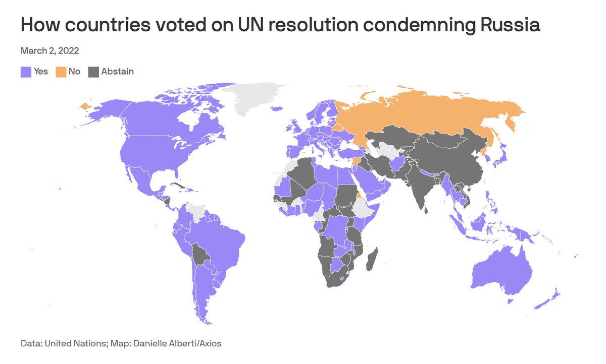Ukraine war: UN overwhelmingly condemns invasion as... | Euronews The United Nations General Assembly overwhelmingly demanded an immediate halt to Russia's invasion of Ukraine. The vote on the resolution, entitled "Aggression against Ukraine," was 141-5 with 35 abstentions. Russia got support for its appeal to vote against the resolution only from Belarus...
